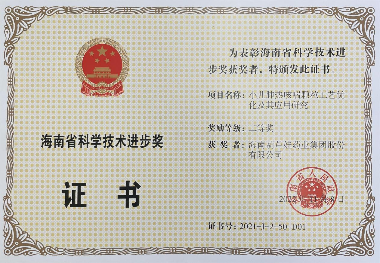 为此,小儿肺热咳喘颗粒的制备方法获得了第二十一届中国专利优秀奖(2019年),专利申请号:ZL201010134951,此次作为专利技术的应用,获得了2021年度海南省科学技术进步奖二等奖。在此之前,尊龙凯时牌小儿肺热咳喘颗粒还多次被授予“临床价值中成药品牌”、“中国连锁药店最具合作价值单品”,荣登“中国医药品牌榜”。